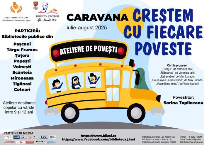 ๐รn luna iulie a acestui an, de poveศtile din Caravana โCreศtem cu fiecare povesteโ: ateliere de poveศti pentru copii s-au bucurat copiii din localitฤศile Paศcani, ศuศora, Tรขrgu Frumos, Popeศti ศi Voineศti. Continuฤm ศi รฎn luna august sฤ ducem poveศtile รฎn alte patru biblioteci publice din judeศul Iaศi, dupฤ cum urmeazฤ: