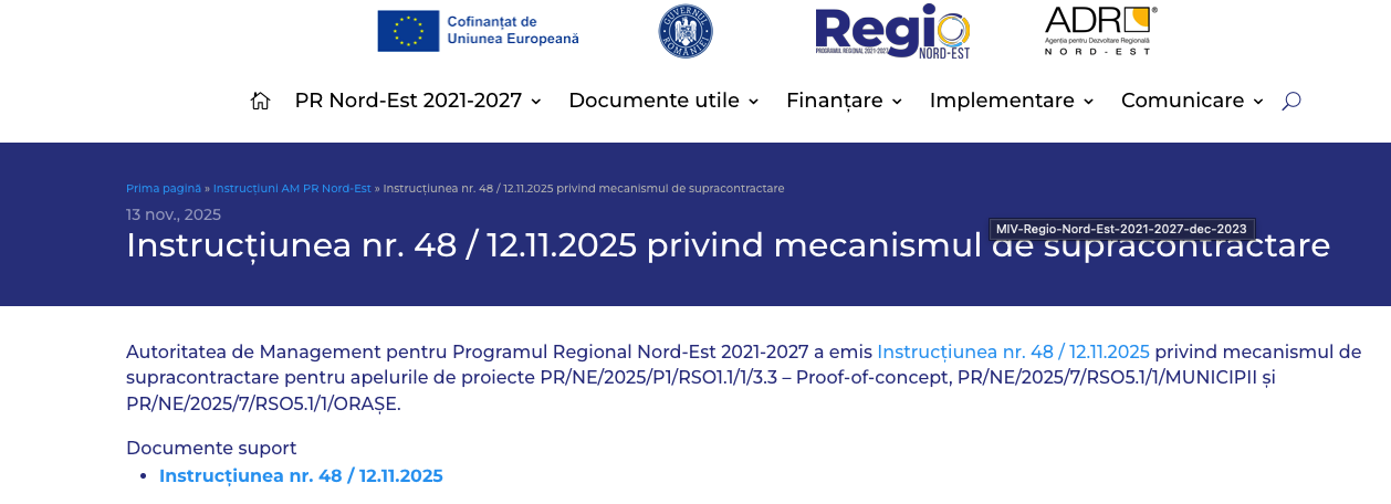 Autoritatea de Management pentru Programul Regional Nord-Est 2021-2027 a emis Instrucțiunea nr. 48 / 12.11.2025 privind mecanismul de supracontractare pentru apelurile de proiecte PR/NE/2025/P1/RSO1.1/1/3.3 – Proof-of-concept, PR/NE/2025/7/RSO5.1/1/MUNICIPII și PR/NE/2025/7/RSO5.1/1/ORAȘE.