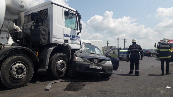 UPDATE: Accidentul s-a petrecut în faţa dealerului auto Sandra Trading. Şoferul care se afla la volanul betonierei afirmă că se deplasa dinspre Leţcani spre Iaşi. Autoturismul Dacia se deplasa din direcţia opusă. La efectuarea manevrei la stânga, pentru a intra la Sandra Trading, şoferul din maşina Dacia nu a acordat prioritate şi a intrat în faţa betonierei. Din cauza greutăţii maşinii, betoniera a frânat brusc, dar nu a putut evita accidentul.