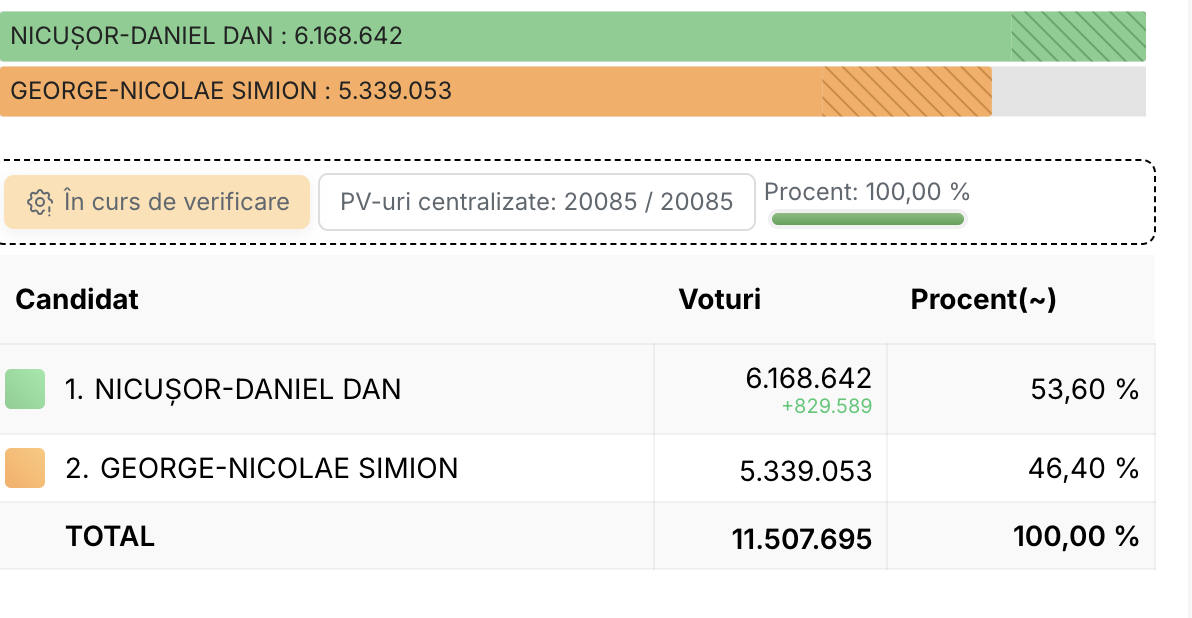 Nicușor Dan este noul președinte ales al României, după centralizarea a 100% dintre procesele verbale din secțiile de vot din țară și străinătate. În procente, Nicușor Dan a obținut 53,6%, iar George Simion – 46,4%.