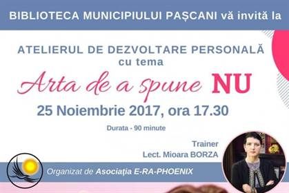 Asociatia E-ra-Phoenix organizeaza pe 25 noiembrie, de la ora 17:30, inca un atelier de dezvoltare personala, la Biblioteca Municipala din Pascani.