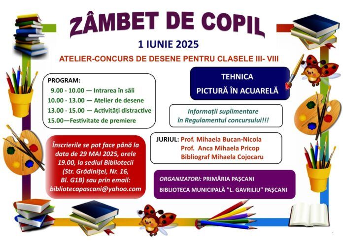 Biblioteca Municipală Leonard Gavriliu din Pașcani organizează o nouă ediție a atelierului-concurs de desene pentru clasele III-VIII, pe 1 iunie, de Ziua Copilului. Tehnica din acest an este pictura în acuarelă, iar înscrierile se pot face până la data de 29 mai, ora 19:00, la sediul bibliotecii sau prin email – bibliotecapascani@yahoo.com.