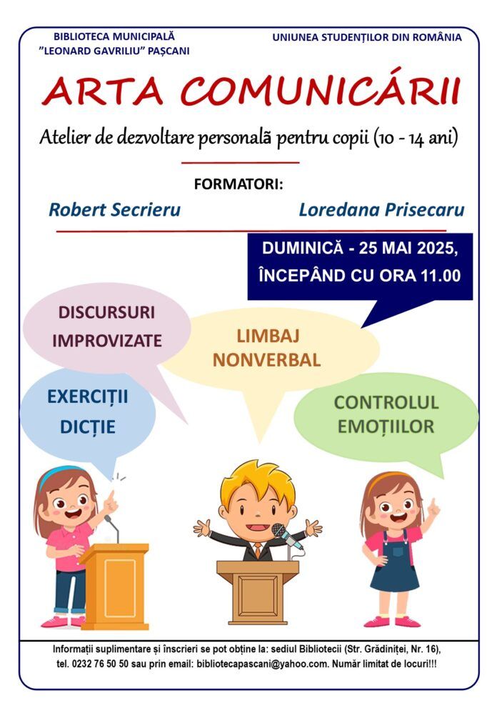 Duminică, 25 mai 2025, începând cu ora 11:00, Biblioteca Municipală „Leonard Gavriliu” din Pașcani organizează un atelier de dezvoltare personală „Arta Comunicării”, dedicat copiilor cu vârste între 10 și 14 ani.