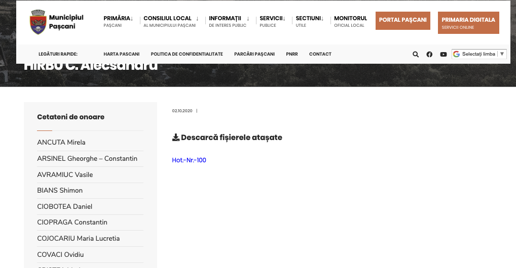 Nepăsare și lipsă de respect față de cetățenii de onoare ai municipiului Pașcani. Pe lista publicată pe site-ul primăriei se află 21 de personalități care au făcut și fac cinste Pașcaniului și au contribuit, prin activitatea lor în diverse domenii, la dezvoltarea și promovarea municipiului. Printre ei se află scriitori, sportivi, medici și profesori sau învățători, dar și foști manageri sau oameni de afaceri. Chiar și Preafericitul Părinte Patriarh Daniel (Ciobotea), Patriarhul Bisericii.
