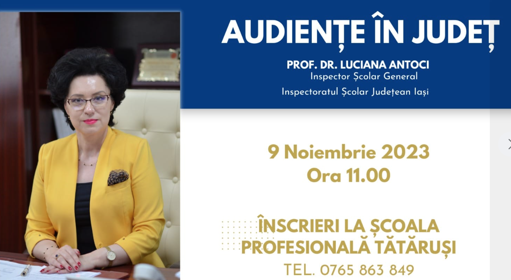 Inspectoratul Școlar General Iași va organiza audiențe lunare în teritoriu. Prima întâlnire va avea loc la Tătăruși, joi, 9 noiembrie, conform informațiilor de pe pagina de Facebook a instituției.