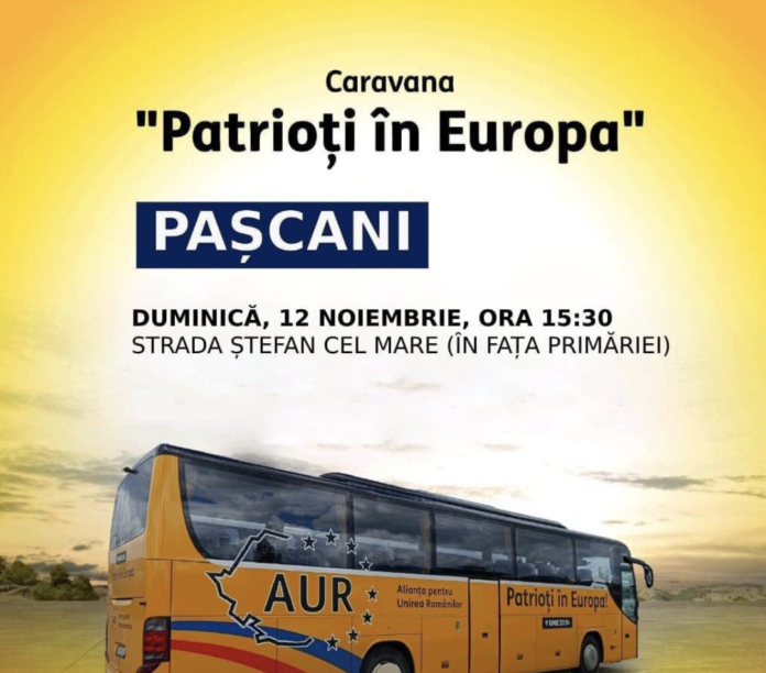 „ Candidații AUR pentru Parlamentul European vin în județul nostru!Caravana AUR „Patrioți în Europa” va poposi la Pașcani, duminică, 12 noiembrie, în fața Primăriei municipiului, de pe strada Ștefan cel Mare, începând cu ora 15.30! Vă așteptăm duminică, 12 noiembrie, ora 15.30, să-i cunoașteți pe cei care vor lupta pentru drepturile noastre în Europa.” se arată într-un comunicat postat pe Facebook.