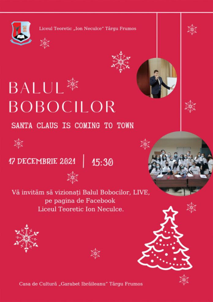 Boboceii de la Liceul Teoretic Ion Neculce din orașul Târgu Frumos vor trece vineri, 17 decembrie, de la ora 15:30, prin emoțiile primului bal din viața de liceean. Pe scena Casei de Cultura „Garabet Ibrăileanu” va avea loc Balul Bobocilor și pentru că este în apropiere de sărbătorile de iarnă, poartă denumirea de „Santa Claus Is Coming to Town”.