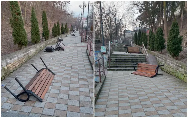 La câteva zile după ce Poliția Locală Pașcani a început o amplă campanie de depistare și sancționare a ilegalităților făcute pe domeniul public, băncile și coșurile de pe scările mici au fost răsturnate.
