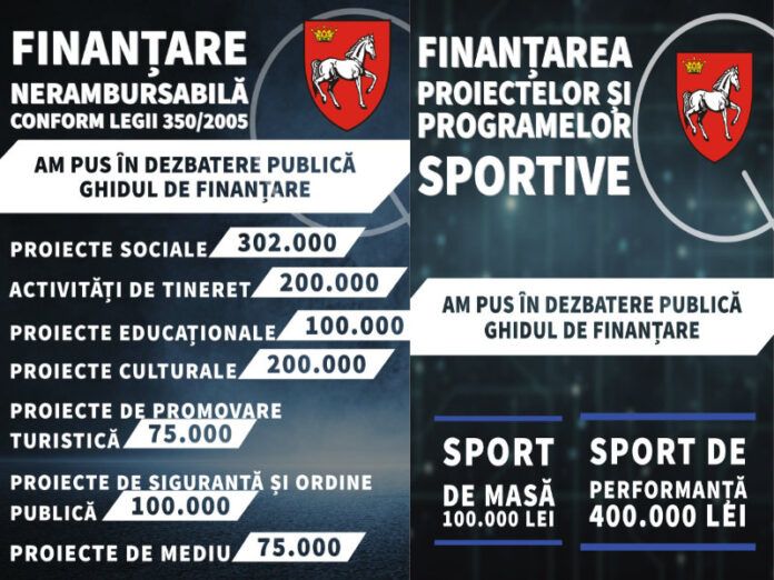 Ca noutate, în anul 2022, din suma totală alocată finanțărilor nerambursabile, 500.000 de lei au ca destinație proiectele și acțiunile din domeniul sportului, din care 400.000 de lei pentru “Sportul de performanță” și 100.000 de lei pentru programul „Sportul pentru toți”.