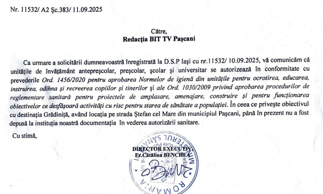 De asemenea, edilul a precizat că ar fi fost deja depuse documentațiile pentru eliberarea avizelor. Din răspunsul pentru BIT TV al DSP Iași reiese că „până în prezent nu a fost depusă la instituția noastră documentația în vederea autorizării sanitare”.
