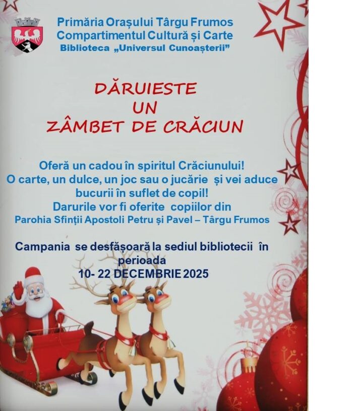 „În perioada 10 decembrie – 22 decembrie, Primăria Târgu Frumos și Biblioteca „Universul Cunoașterii” lansează campania „Dăruiește un zâmbet de Crăciun”, creată cu ocazia sărbătorilor de iarnă pentru a răspândi veselie, voie bună și încredere copiilor.