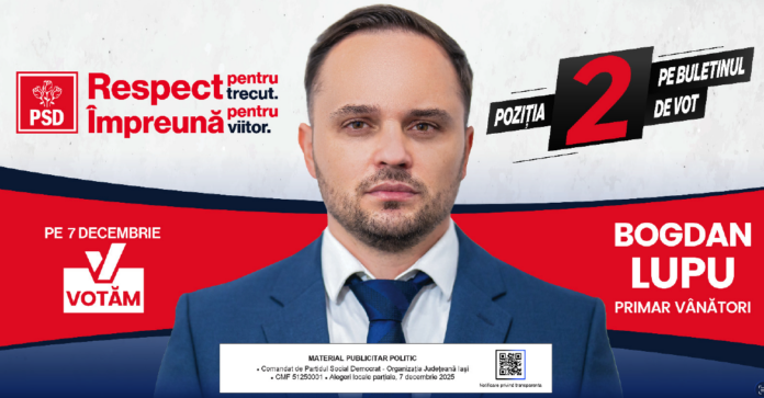 Duminică vă invit să veniți la vot și să alegeți continuitatea și respectul pentru oameni.” – Bogdan Lupu, candidat PSD la funcția de primar al comunei Vânători. (P)