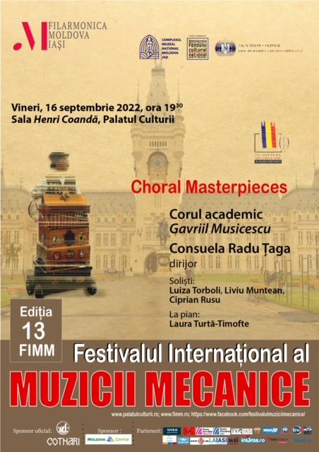 În cadrul acestui renumit festival, Corul academic „Gavriil Musicescu” al FILARMONICII MOLDOVA din IAȘI va susține vineri, 16 septembrie 2022, ora 19,30, în Sala „Henri Coandă” – Palatul Culturii, un concert coral intitulat CHORAL MASTERPIECES.