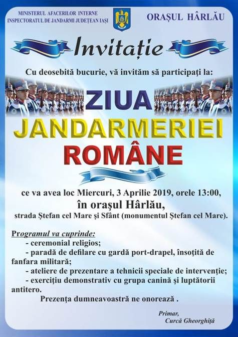 Ziua Jandarmeriei Romane, sarbatorita in fiecare an pe data de 3 aprilie, va fi marcata prin activitati de amploare si in orasul Hirlau. Miercuri, 3 aprilie, de la ora 13:00, pe strada Stefan cel Mare si Sfant, langa monumentul marelui domnitor, va avea loc un program specific acestei sarbatori. Publicul va participa la un ceremonial religios, parada de difilare cu garda port-drapel, insotita de fanfara militara, ateliere de prezentare a tehnicii speciale de interventie si un exercitiu demonstrativ cu grupa canina si luptatorii antitero.