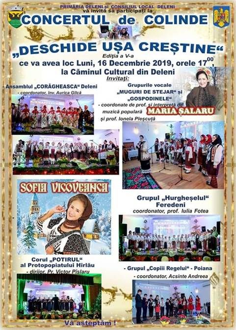 E vremea colindelor! Primaria si Consiliul Local Deleni va invita luni, 16 decembrie, de la ora 17:00, la cea de-a V-a editie a Concertului „Deschide usa, crestine”. Evenimentul va avea loc la Caminul Cultural din localitate, iar printre invitati se afla Ansamblul Coragheasca, Grupurile vocale „Muguri de stejar” si „Gospodinele”, Grupul „Hurgheselul” Feredeni, „Copiii Regelui” Poiana si Corul „Potirul” al Protopopiatului Hirlau.