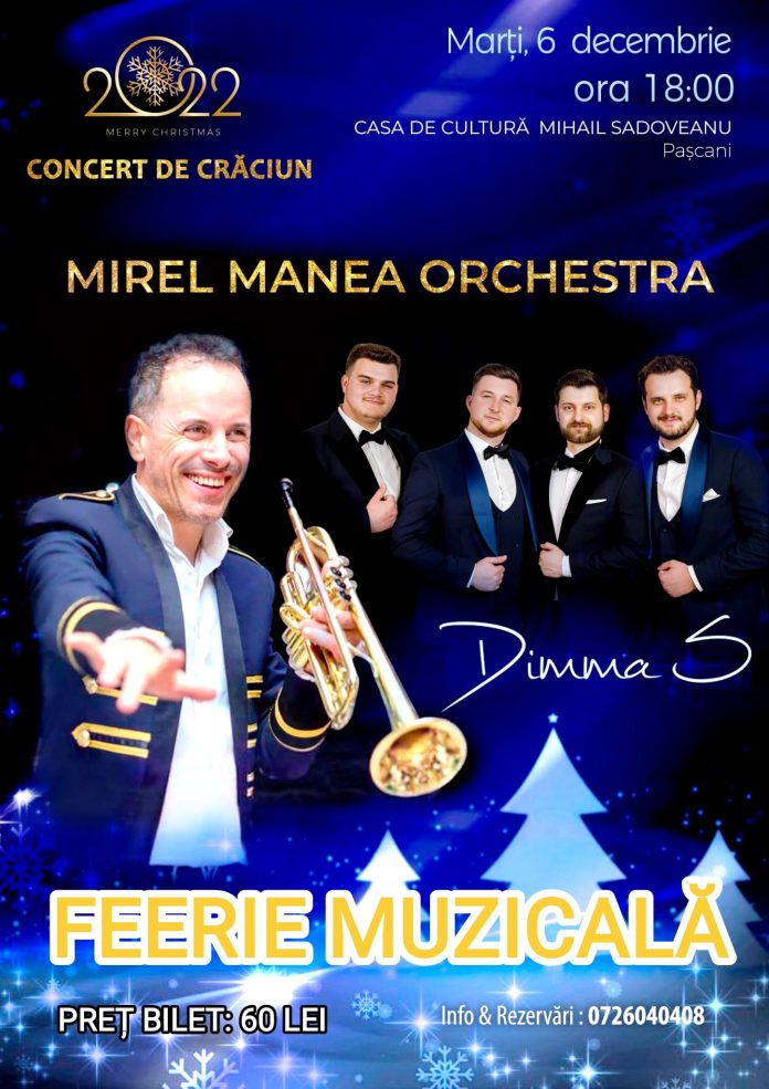 „Îndrăgitul trompetist MIREL MANEA revine la Pașcani alături de band-ul său pentru a ne bucura sufletele în prag de sărbători. Alături de el, invitații speciali vor fi tenorii de la DIMMA’S.