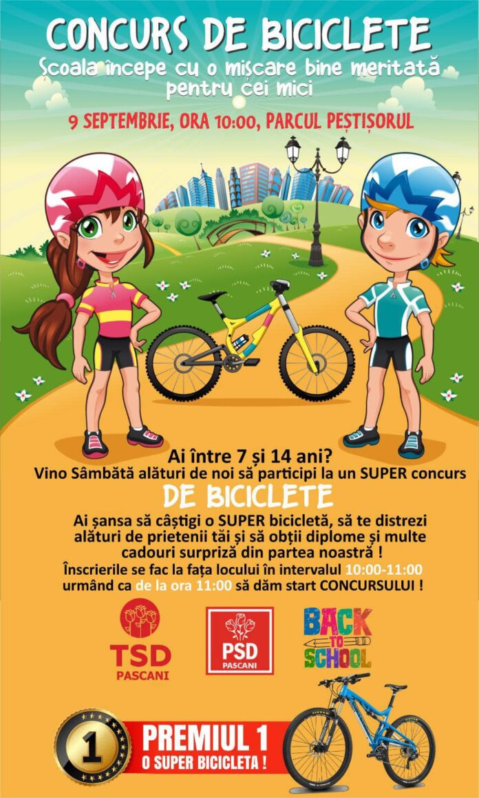 Concurs de biciclete înaintea de începerea școlii, în municipiul Pașcani, în Parcul Peștișorul. Organizația Tinerilor Sociali Democrați din municipiul Pașcani invită toți copiii cu vârste între 7 și 14 ani să participe sâmbătă, 9 septembrie, de dimineață, la un concurs în aer liber, în ultimele zile din vacanța mare. Înscrierile se fac între orele 10-11, iar apoi va fi dat startul pedalării.