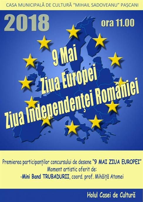 Ziua de 9 mai are pentru poporului român o triplă semnificaţie. Pe lângă Ziua Independenţei proclamată în 1877, românii sărbătoresc Victoria Coaliţiei Naţiunilor Unite în cel de-al Doilea Război Mondial la 9 mai 1945, dar şi Ziua Europei. Cu această ocazie Casa Municipală de Cultură vă invită să participați miercuri, 9 mai 2017, la ora 11.00 la premierea concursului de desene intitulat ,,9 mai ziua Europei” . De asemenea va avea loc un moment artistic susținut de Mini Band Trubadurii condus de Mihăiță Atomei. Programul va avea loc în holul Casei de Cultură. Expoziția de desene va putea fi vizitată începând de marți, 7 mai în holul instituției.
