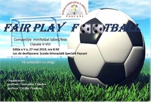 Avem plăcerea de a vă invita să participați la concursul „Fair Play Football”, ediția a V a, organizat de Școala Gimnazială Specială Pașcani, în data de 27 mai 2019, începând cu ora 8.30.