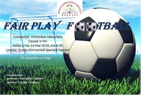 Scoala Gimnaziala Pascani organizeaza luni, 14 mai, concursul ” Fair Play Football” la minifotbal băieți/fete. Competitia se adresează tuturor elevilor din clasele V-VIII, nu numai școlilor speciale.