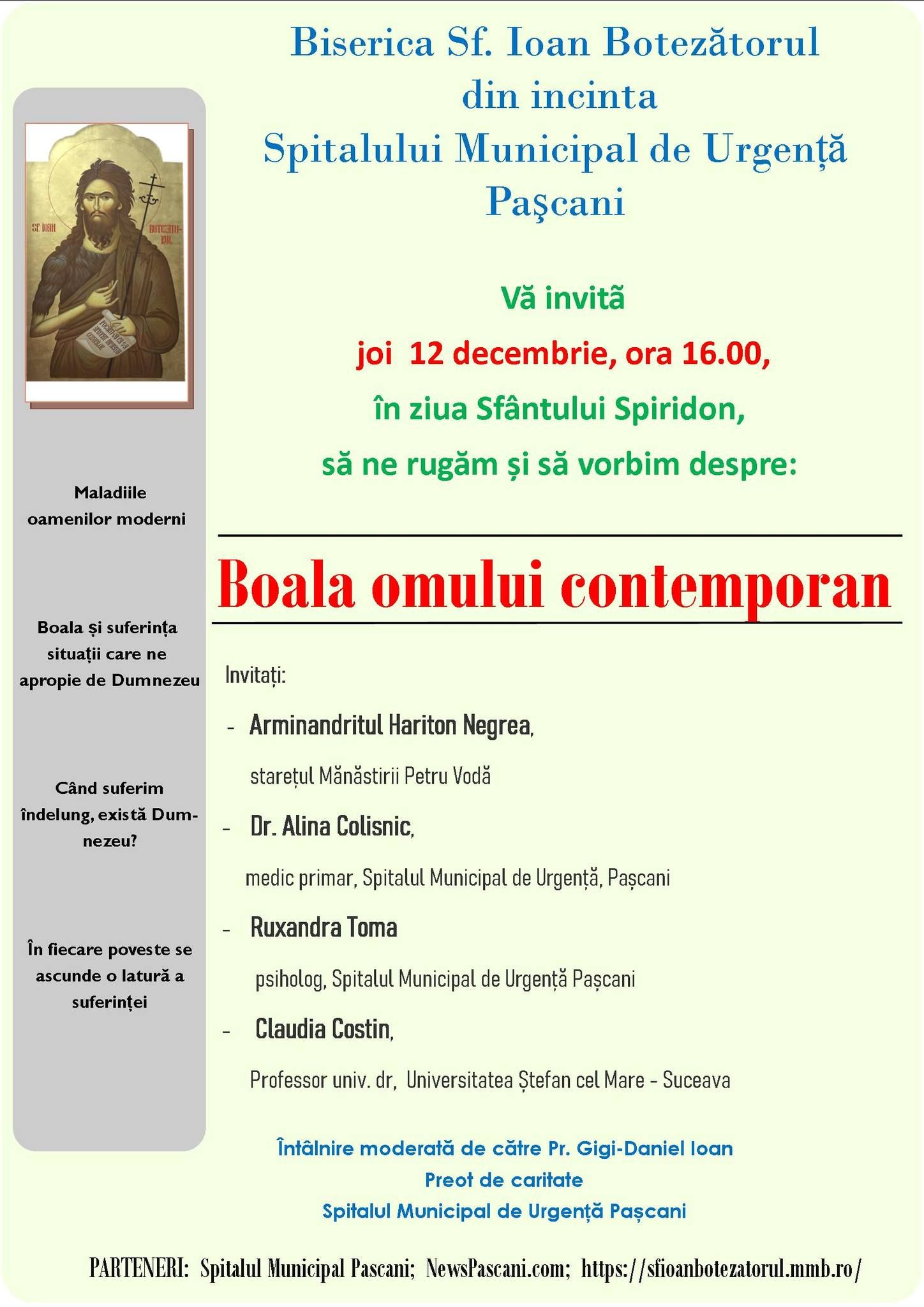 Biserica Sfântul Ioan Botezătorul din incinta Spitalului Municipal de Urgență din Pașcani vă invită joi, 12 decembrie, de la ora 16:00, în ziua Sfântului Spiridon la o conferință cu o temă actuală: Boala omului contemporan.