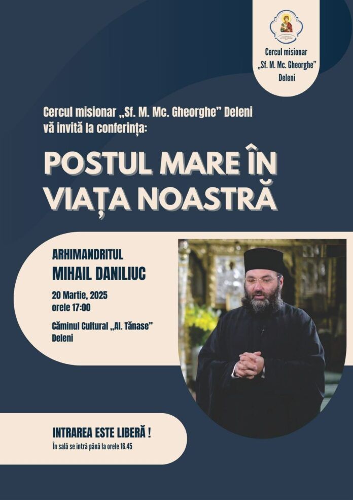 Cercul misionar „Sf. M. Mc. Gheorghe” vă invită la conferința „Postul Mare în viața noastră” susținută de părintele arhimandrit Mihail Daniliuc.