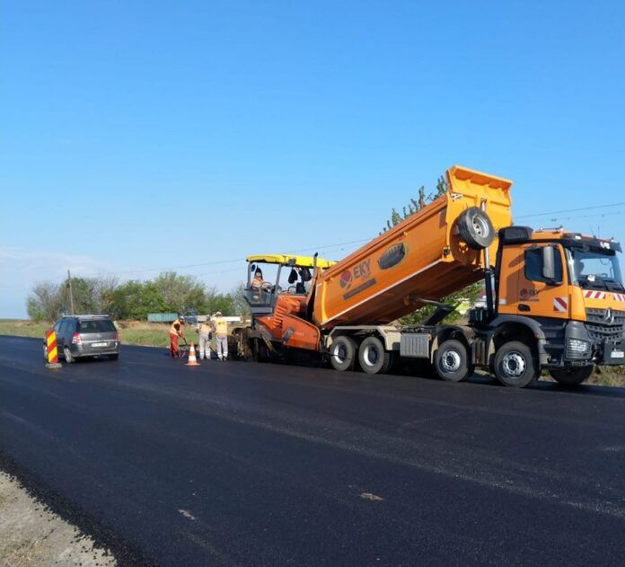 Continuă lucrările de așternere a covorului asfaltic pe DN 28, Bălțați – Podu Iloaiei, județul Iași. Imagine din zona localității Sârca.