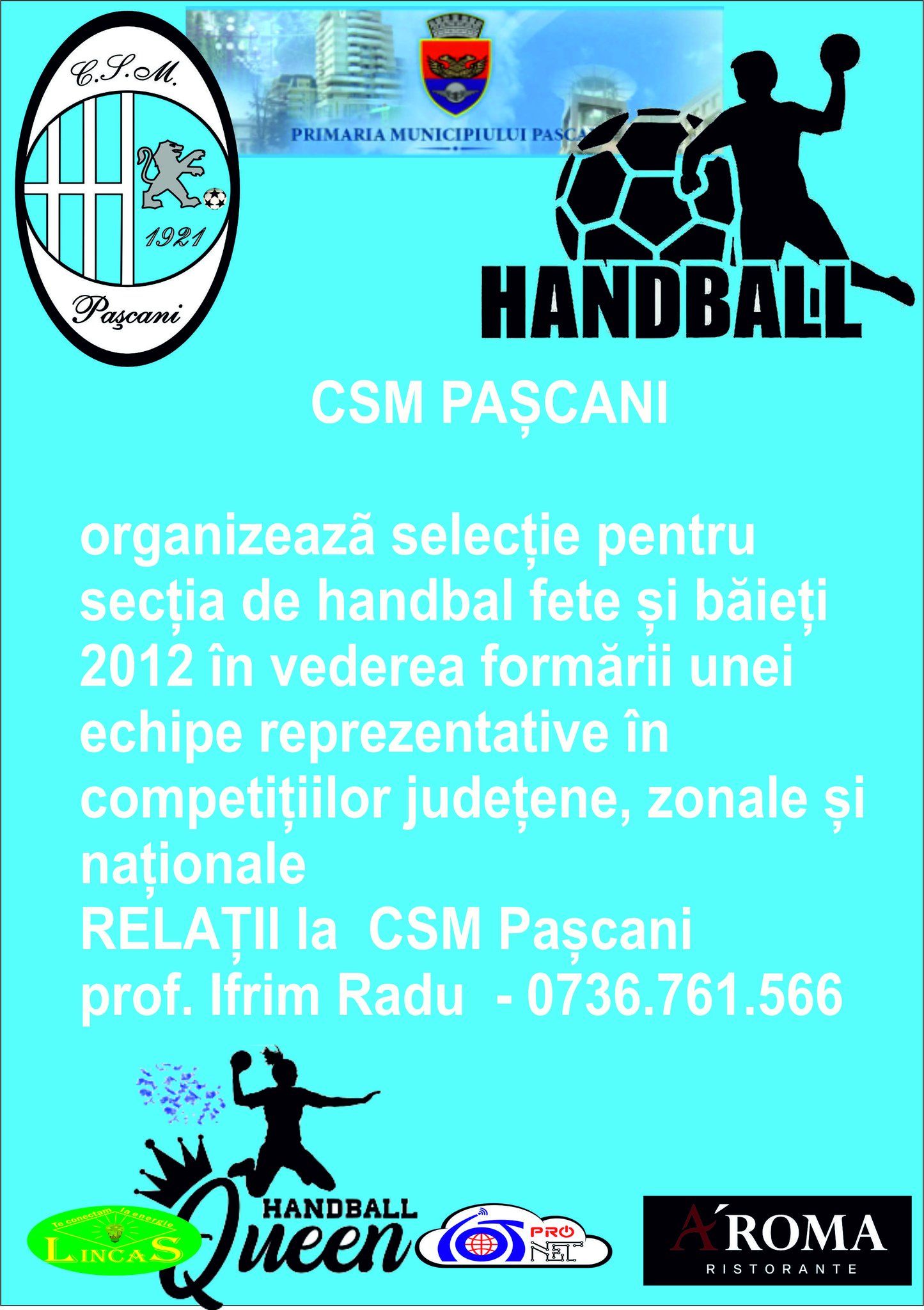 Anunț important pentru tinerii care îndrăgesc mișcarea și vor să facă sport. CSM Pașcani organizează selecție pentru secția de handbal fete și băieți.