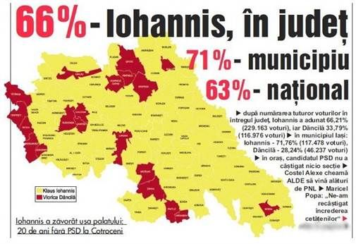 La urne s-au prezentat ieri 352.463 de alegători în judeţul Iaşi, iar 346.139 de voturi au fost declarate valabil exprimate, în timp ce restul au fost nule. Klaus Iohannis a obţinut 229.163 voturi (66%), iar Viorica Dăncilă 116.976 voturi (34%). În 2014, în turul II, Iohannis aduna la Iaşi 207.223 voturi, astfel că ieri a reuşit să aibă un plus de 21.940 voturi. Cea mai mare parte a voturilor în plus a venit din afara municipiului, în condiţiile în care, ieri, Iohannis a avut 117.478 de voturi în municipiul Iaşi faţă de cele 112.068 voturi în turul II din 2014.