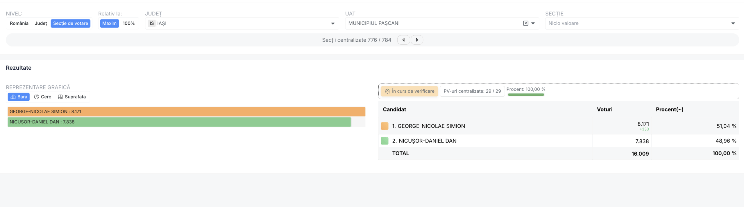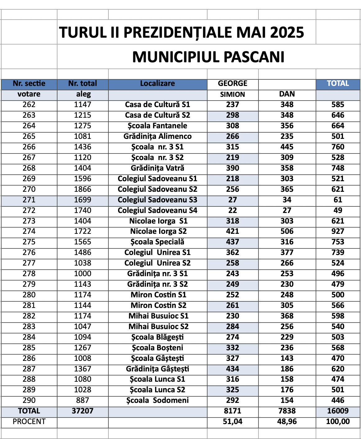 La Pașcani al doilea tur al alegerilor prezidențiale a fost câștigat de George Simion de la AUR. El a obținut 51,04% din voturi – 8171 voturi. Candidatul independent Nicușor Dan a obținut 48,96 % din voturi adică 7838 voturi.