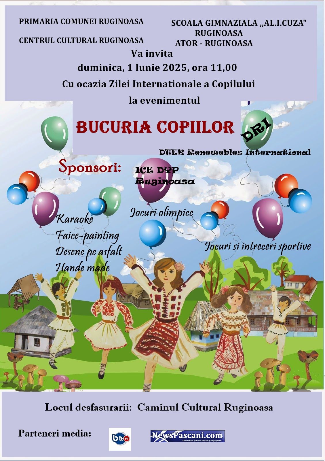 Duminică, 1 iunie, de la ora 11:00, Ziua Internațională a Copilului va fi sărbătorită cu multă bucurie la Ruginoasa. Sărbătoriții zilei sunt invitați la Căminul Cultural unde vor avea parte de activități distractive și multă voie bună.