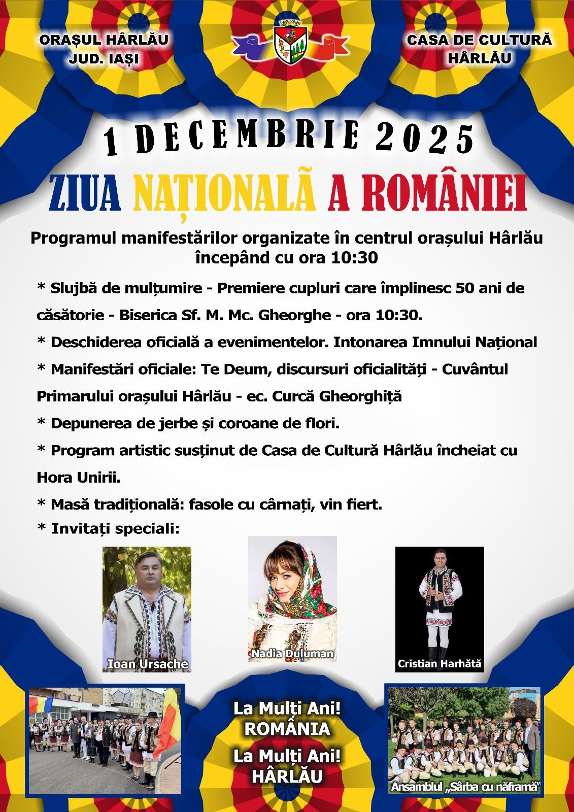 Ziua Națională a României va fi sărbătorită așa cum se cuvine și la Hârlău. Luni, 1 decembrie, sărbătoarea va începe cu premierea cuplurilor de aur la Biserica Sf. Mc. Gheorghe.