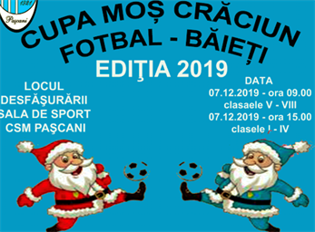 Invitatie la fotbal pentru copiii pascaneni. Clubul Sportiv Municipal organzieaza, la sfarsitul acestei saptamani, a opta editie a Cupei “ Mos Craciun” la fotbal pentru baietii din clasele 1- VIII. Competitia este programata la sala de sport de la Stadionul municipal, pe 7 decembrie incepand cu ora 09.00.