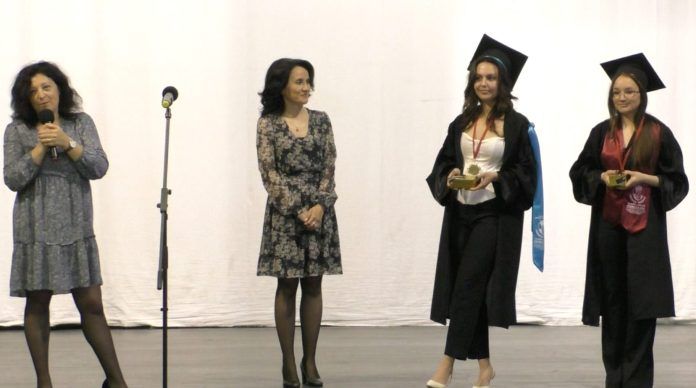 Apoi, au fost chemate pe scenă cele două șefe de promoție, de zece. Maria Mălina Harasim și Niculina-Adelina Aileni au terminat cei patru ani de liceu cu media generală maximă.