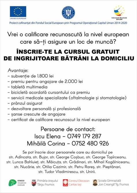Locuitorii orașului Târgu Frumos se pot înscrie la cursuri de calificare profesionala gratuite. Sunt vizați cei care au domiciliul pe străzile Adîncata, Bujor, George Coșbuc, George Topîrceanu, Lunca Bahluieț, Măicuța, Grădinari, Mihail Kogălniceanu, Nucărie, Otilia Cazimir, Petru Rareș, Pieptănari, Tudor Vladimirescu, Unirii.