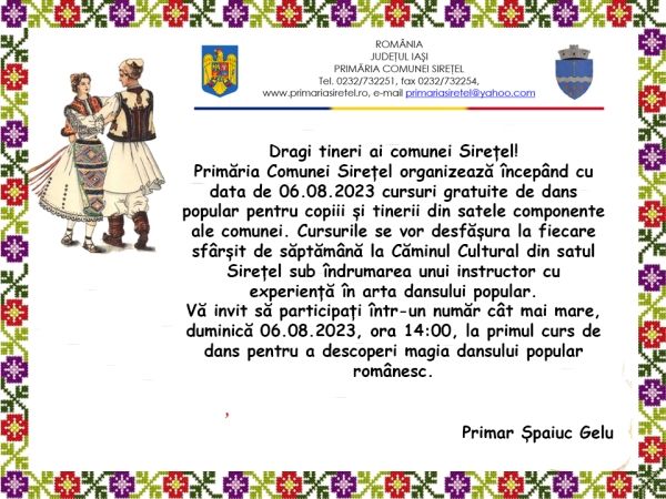 „Dragi tineri ai comunei Siretel! Primăria comunei Siretel organizează începând cu data de 06.08.2023 cursuri gratuite de dans popular pentru copiii si tinerii din satele componente ale comunei. Cursurile se vor desfășura la fiecare sfârșit de săptămâna, la căminul cultural din Satul Siretel, sub îndrumarea unui instructor cu experiența in arta dansului popular.