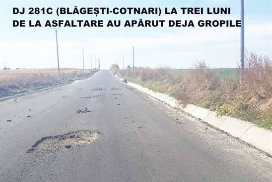 Apariţia unor gropi în stratul de asfalt abia turnat pe DJ 281C între Blăgeşti şi Todireşti a stârnit nedumerire în rândul localnicilor din zonă. Imagini afişate pe pagina „Radar oficial“ arată stratul de asfalt spart în câteva locuri, astfel încât se poate vedea piatra folosită la fundaţia drumului. Autorul imaginilor, Gabriel Gârbea, ne-a declarat că asfaltul a cedat în mai multe locuri, mai ales pe raza localităţii Todireşti.