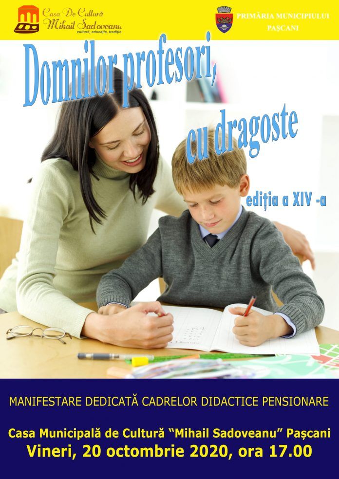 Casa de Cultura Mihail Sadoveanu din municipiul Pascani va organiza si in acest an inca o editie a evenimentului cultural „Domnilor profesori, cu dragoste!”, dedicata de aceasta data cadrelor didactice din invatamantul prescolar. Va avea loc vineri, 20 noiembrie 2020, de la ora 17:00.