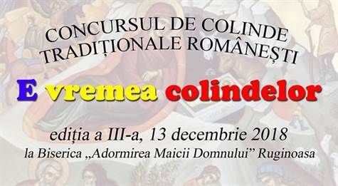 Parohia Adormirea Maicii Domnului din Ruginoasa, in parteneriat cu Parohia Sfantul Nicolae din Tatarusi si Mitropolia Moldovei si Bucovinei, va organiza joi, 13 decembrie, cea de-a treia editie a Concursului de Colinde Traditionale Romanesti „E vremea colindelor”.