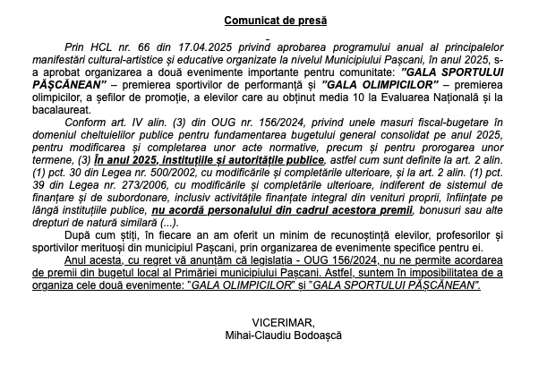 Vești neplăcute pentru tinerii și sportivii cu rezultate bune la învățătură din Pașcani. În acest an, administrația locală nu va mai organiza festivitatea de premiere, programată în prima parte a lunii iulie a.c., pentru șefii de promoție, olimpici, elevii cu nota zece la Evaluarea Națională și Bacalaureat și sportivii cu performanțe.