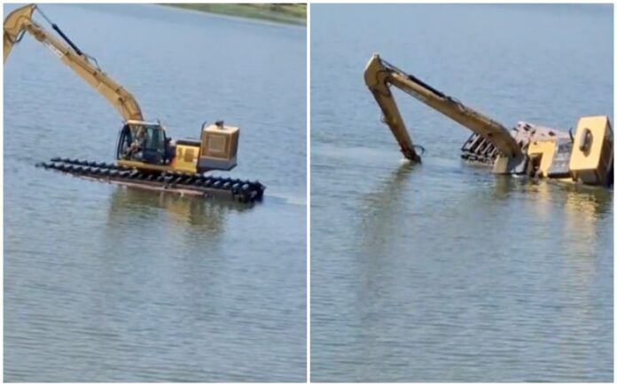 Incidentul a fost filmat și a apărut pe internet. Pe imagini se observă cum utilajul dispare în apă.