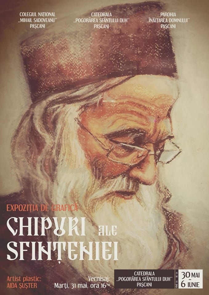 Catedrala ”Pogorârea Sfântului Duh” și Parohia ”Înălțarea Domnului”, în colaborare cu Colegiul Național ”Mihail Sadoveanu” vă invită, în perioada 30 mai – 6 iunie 2022, vizitați expoziția (itinerantă) de grafică CHIPURI ALE SFINȚENIEI, semnată de artista Aida Șușter.