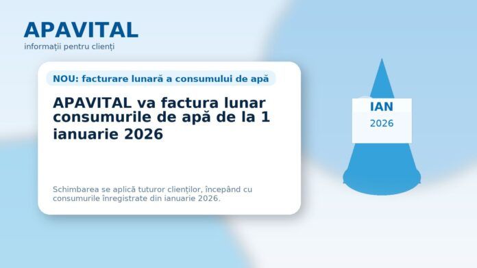 Societatea APAVITAL S.A. aduce la cunoștința utilizatorilor serviciului public de alimentare cu apă și canalizare că, începând cu data de 1 ianuarie 2026, citirea contoarelor de apă se va realiza lunar, iar facturile vor fi emise și transmise cu aceeași periodicitate.
