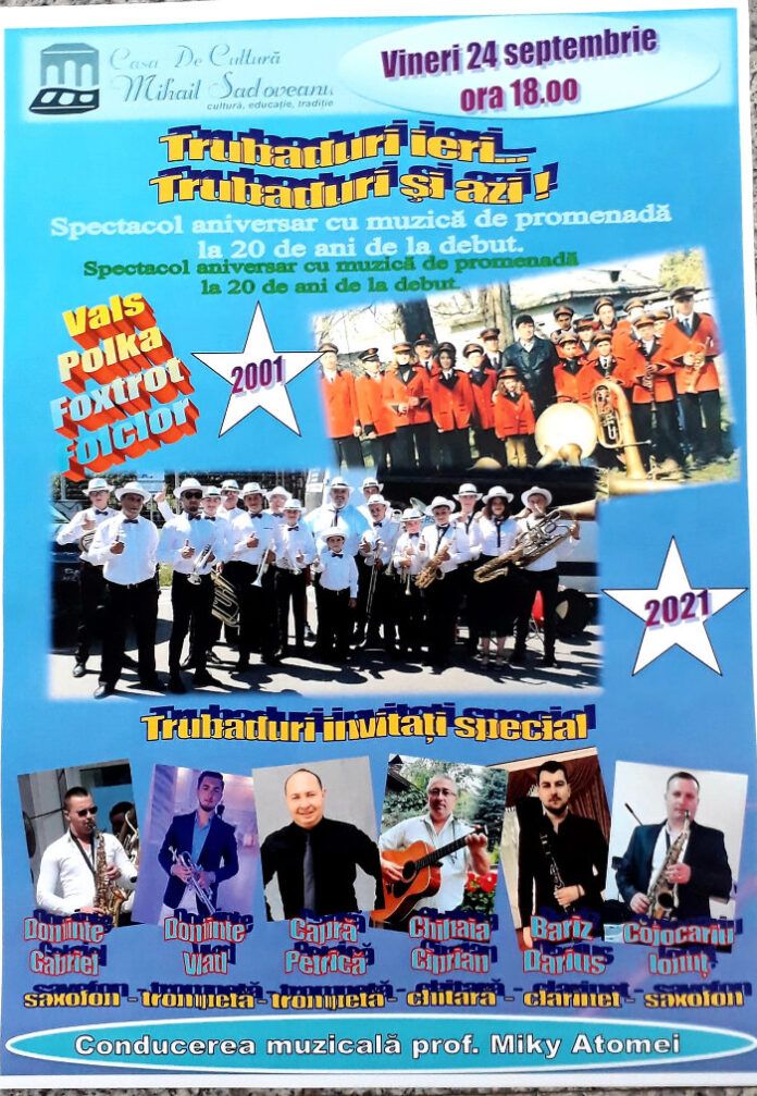 Fanfara „Trubadurii” de la Casa de Cultura Mihail Sadoveanu Pașcani vă invită la un spectacol aniversar, pe 24 septembrie, de la ora 18:00. Se vor serba 20 de ani de cand a luat fiinta fanfara, sub conducerea dirijorală a prof. Miky Atomei.