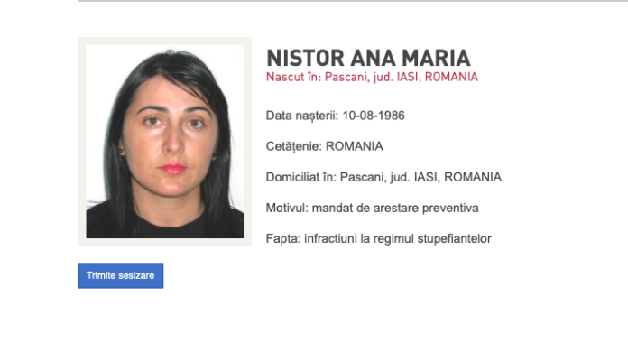 O femeie din municipiul Pașcani este dată în urmărire de Poliție pentru infracțiuni la regimul stupefiantelor. Pe numele Anei Maria Nistor, în vârstă de 38 de ani a fost emis un mandat de arestare preventivă.