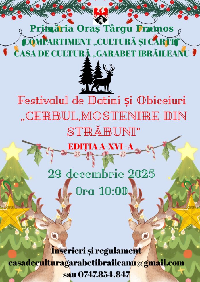 „🦌🦌Luni ,29 DECEMBRIE 2025,va avea loc a-XVI-a ediție a Festivalului de Datini și Obiceiuri 🦌„CERBUL ,MOȘTENIRE DIN STRĂBUNI”🫎 la Târgu Frumos !