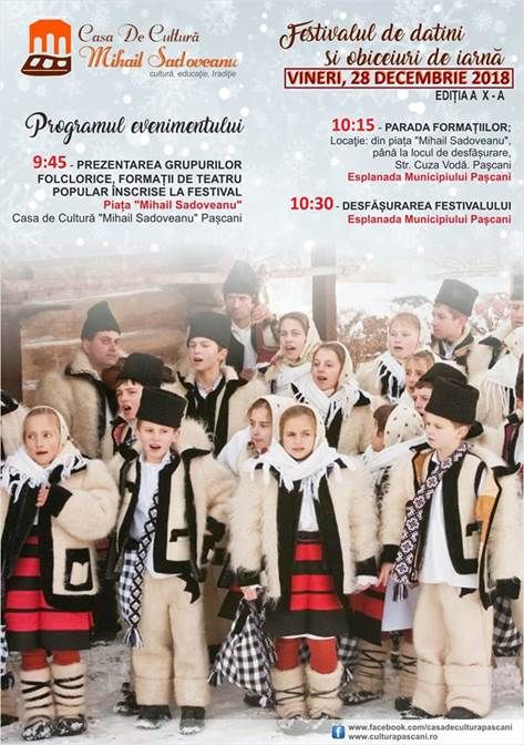 Pascanenii si nu numai sunt asteptati vineri, 28 decembrie a.c., la cea de-a X-a editie a Festivalului de datini si obiceiuri de iarna. Evenimentul va incepe de la ora 9:45 cu prezentarea grupurilor folclorice si a formatiilor de teatru popular inscrise in fata Casei de Cultura „Mihail Sadoveanu”.