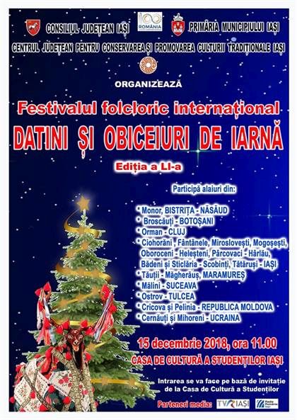 În ziua de 15 decembrie 2018, Consiliul Județean Iași, prin Centrul Județean pentru Conservarea și Promovarea Culturii Tradiționale Iași, în parteneriat cu Primăria Municipiului Iași, va organiza Festivalul folcloric internațional „Datini și obiceiuri de iarnă”Iași a LI-a ediție.