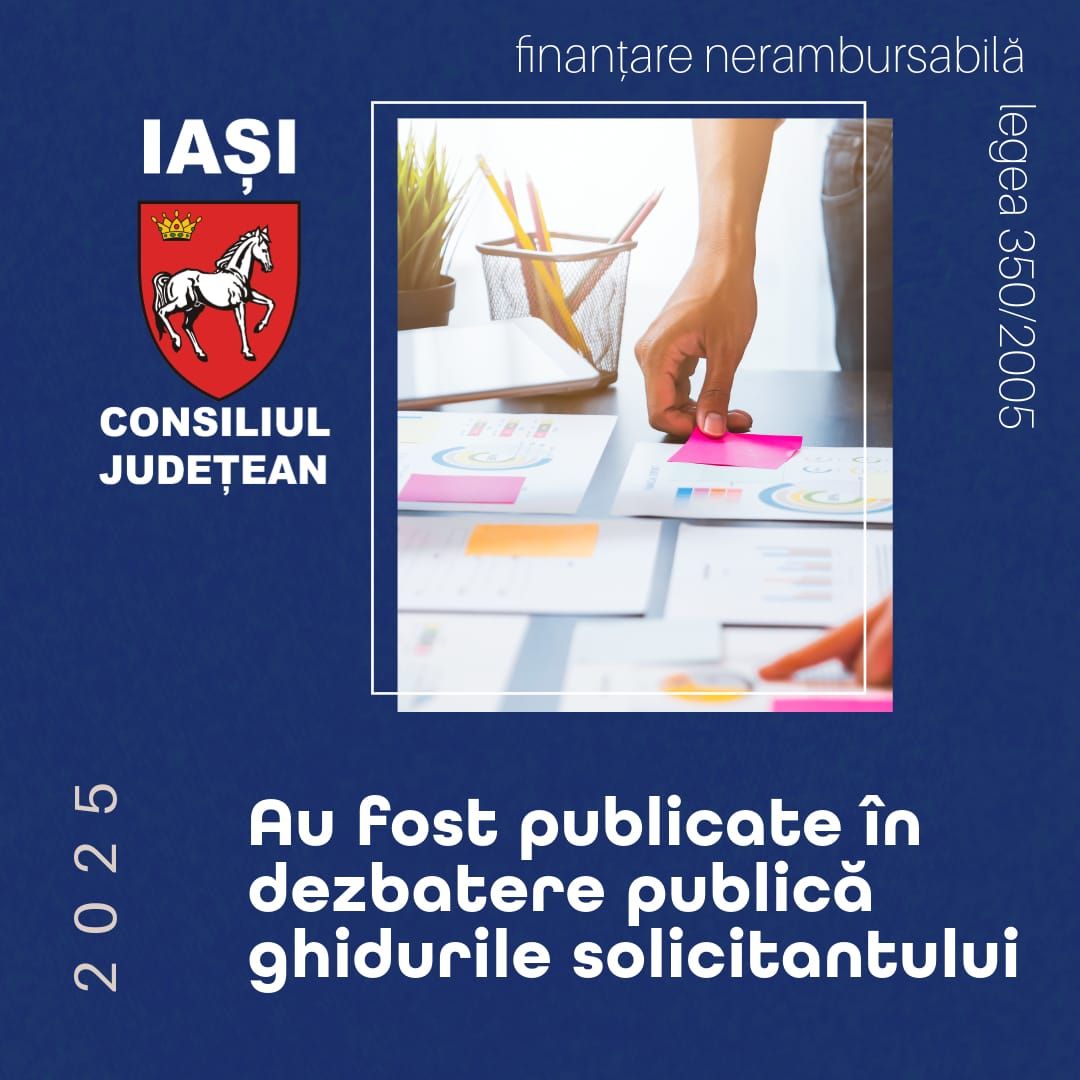 Consiliul Județean Iași a lansat în dezbatere publică modificarea Ghidului Solicitantului în vederea finanțării nerambursabile pentru activități nonprofit de interes județean în baza Legii nr. 350/2005 pentru următoarele domenii: cultură, tineret, social, educație, promovare turistică, protecția mediului, siguranța cetățeanului și ordine publică, precum și modificarea Ghidului Solicitantului pentru programele și proiectele sportive. Termenul pentru trimiterea observațiilor și propunerilor este până pe 4 februarie 2025, ora 16:30 iar perioada de dezbatere publică, până pe 6 martie 2025.
