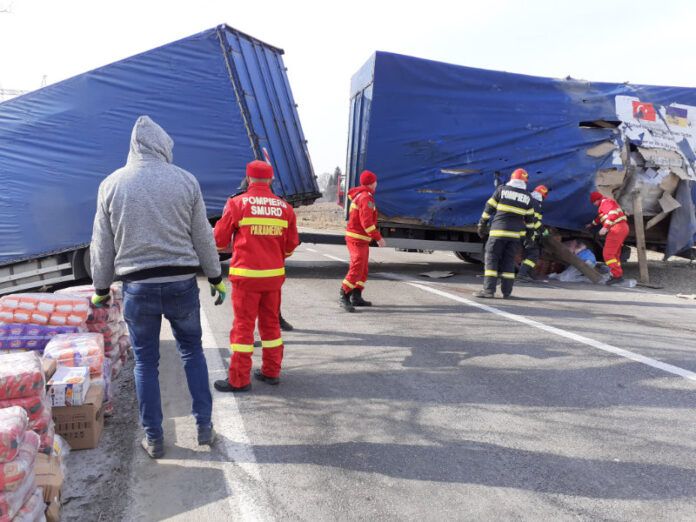 Șoferul, de naționalitate ucraineană, a pierdut controlul camionului, a ieșit din decor iar remorca ansamblului de vehicule a rămas răsturnată pe carosabil, blocând astfel drumul pe ambele sensuri de mers.